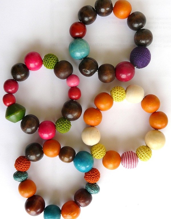 Assorted colorful wood bracelets on elastic to easily slip on and off. These chunky bracelets are cute gifts for birthdays, Christmas stocking gifts or teacher’s thank you gift. Available in the 4 colors combinations shown.
