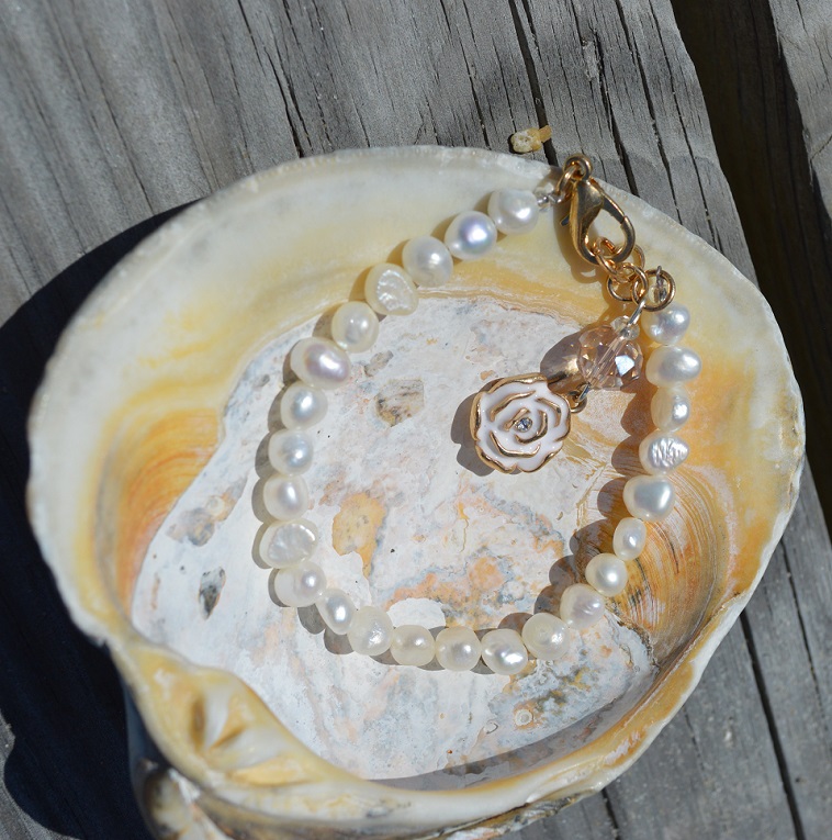 Beautiful Fresh Water Pearl Bracelet with gold plated Rose Pendant and small sparkling crystal. Perfect, meaningful gift for Birthdays, Christenings, Weddings and Christmas.