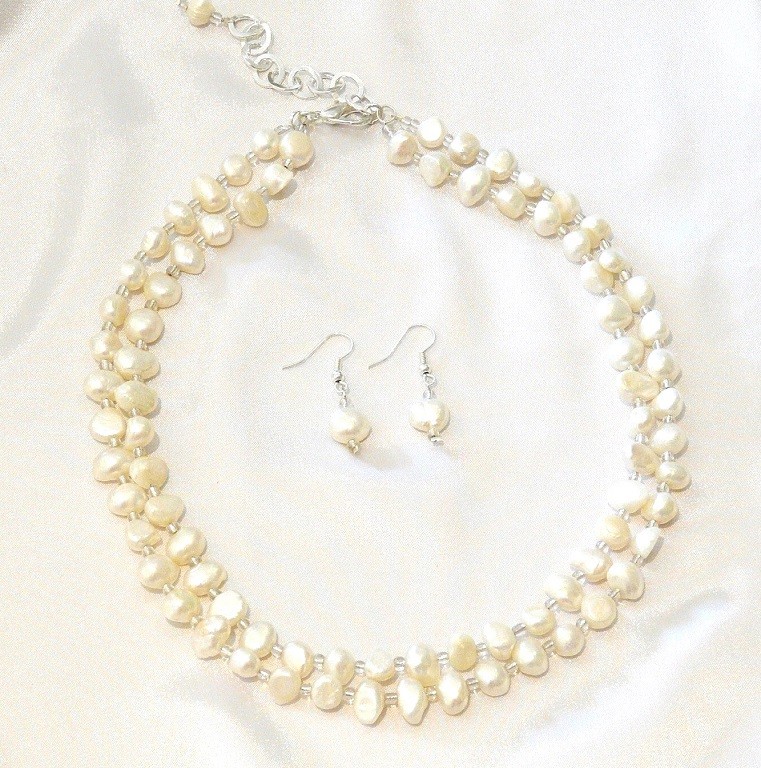Beautiful white Freshwater Pearl Choker available in white or by request in pale silver or pink pearls. The necklace is a double strand design. Matching Earring pairs can be ordered to match in a choice of either nickel free or sterling silver earrings.