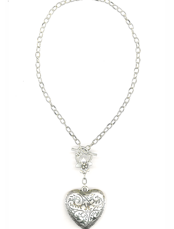 A beautiful Rhodium Heart Necklace with Center Front Floral Clasp. The floral clasp opens and closes with a decorative bar which is engraved with a leaf. This Heart Necklace is perfect for all occasions and can be worn with jeans or a pretty dress on a special occasion. The Clasp is particularly interesting and opens up in the centre front. Although there is no minimum required order on this necklace, this jewelry item sells so quickly that its best to order them per dozen. Please also inquire re earrings to match in either sterling silver or anti allergic nickel free.