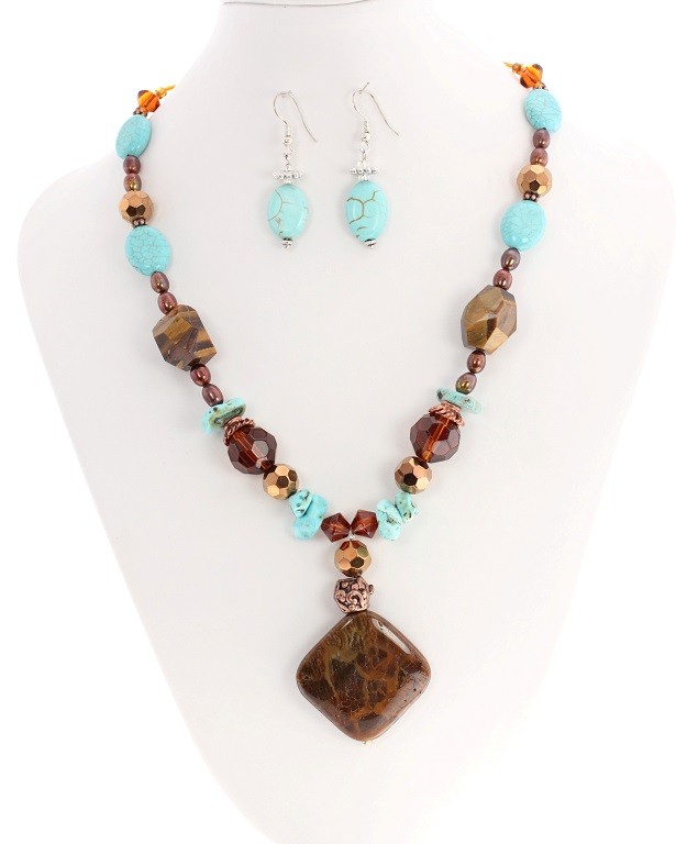 Turquoise and Jasper gemstone Necklace with Crystals, Fresh Water Pearls and Copper Spacers. This Gemstone Necklace has an African element of design and very interesting colour combinations. It is striking, different and definitely an eye-catcher. Everyone will want to know where you got it! This semi precious stone necklace looks great with work clothes and is especially attractive when worn with black.