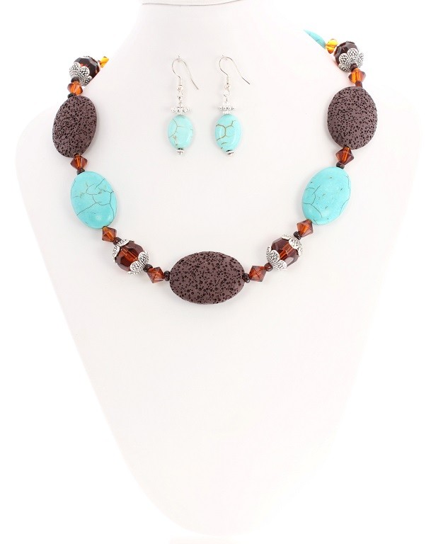 ‘Eternity’ Chocolate Volcanic Lava Necklace with Turquoise semi precious stones and silver-dipped spacers. People are very intrigued by the fact that this is a Lava Necklace! Not only that, but this is a Chocolate Lava Gemstone Necklace! The Turquoise Gemstones highlight and make this Semi Precious Stone Necklace even more striking.