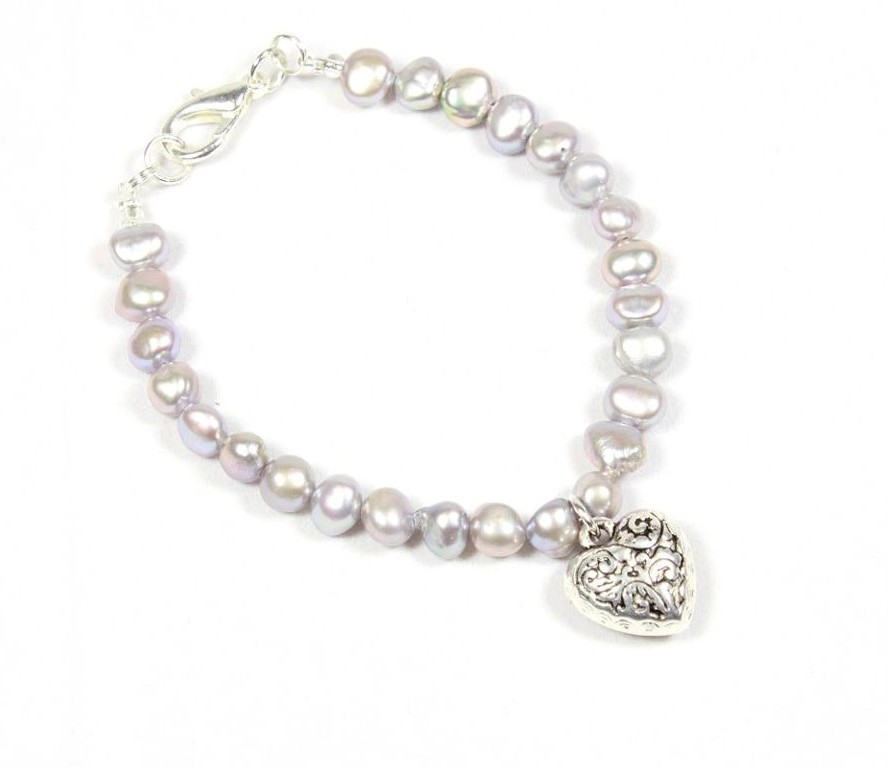 Beautiful Freshwater Pearl Bracelet with Heart pendant. The heart is engraved with antique style patterns and is made from Rhodium metal which is one of the worlds lightest metals. These are great for weddings should you want pearl bracelets for bridesmaids. This pearl bracelet is available in a choice of white, pink or silver freshwater pearls