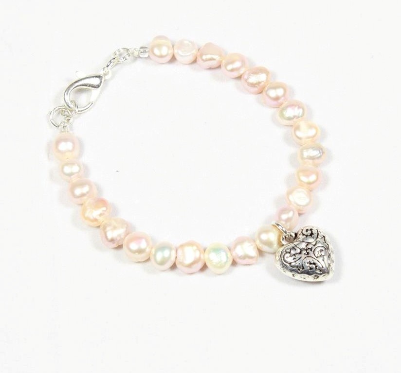 Beautiful Freshwater Pearl Bracelets with mini antique style heart pendant. Available in pink, white or silver pearls. These are perfect for Christening gifts, Christmas stocking gifts and are also perfect for bridesmaids gifts at weddings. Each bracelet has a mini extension chain added for adjustable length.