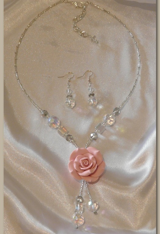 Pink Rose Necklace with Crystals. The Rose is made from fimo pottery. The Rose Necklace is perfect for all ladies who love flowers and femine designs. This Necklace is a ‘happy necklace’ with a Spring theme
