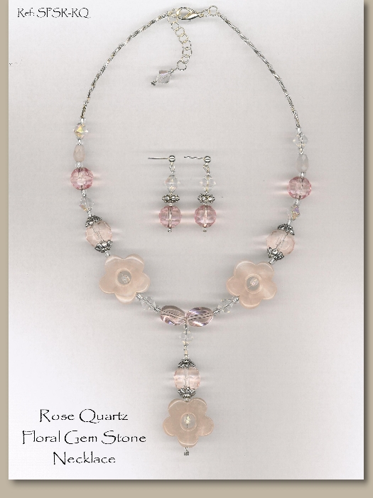 Floral Rose Quartz Necklace. Rose Quartz Semi Precious Stone Necklace with Crystals (Gem Stones are carved into beautiful Flower shapes) This Gemstone Necklace is very feminine in design. Rose Quartz Gemstones traditionally were said to represent Humility, Love, Compassion and Forgiveness. With these beautiful qualities, this Gemstone Necklace makes a really special gift.