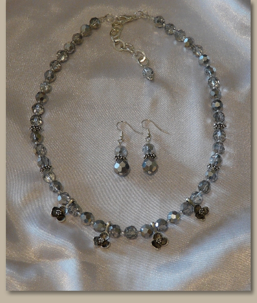 Facetted Silver Crystal Necklace with silver dipped small flower pendants. This Crystal Necklace sparkles as the light catches it and is a beautiful crystal necklace to wear out in the evenings. Due to its neutral colour it really matches any colour and is a very good seller. This item is also perfect as Wedding Jewelry for Bridesmaids.
