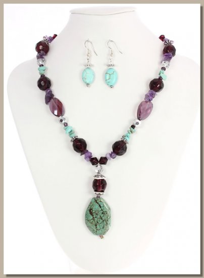 Turquoise and Amethyst Necklace with beautiful facetted crystals, secure clasp and extension chain. This gemstone necklace is a delightful and beautiful mix of deep colours and is a very striking piece of Jewelry to wear. At Sapphire Dawn we always suggest accessorizing with beautiful Jewelry Necklaces in order to make your overall look sophisticated and classy. This Amethyst and Turquoise Necklace is very unique and eye-catching.