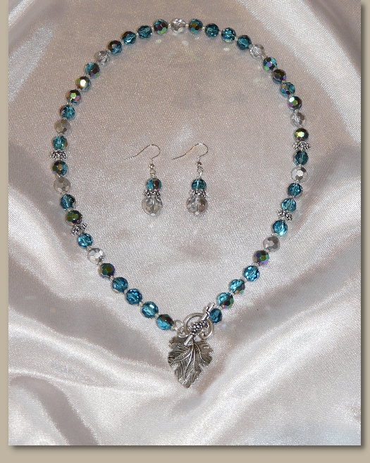 Facetted Turquoise Crystal Necklace with silver dipped decorative Leaf Clasp to be worn either at the front or at the back of the neck. This Crystal Necklace sparkles as the light catches it and is a beautiful crystal necklace to wear out in the evenings. This item is also perfect as Wedding Jewelry for Bridesmaids.