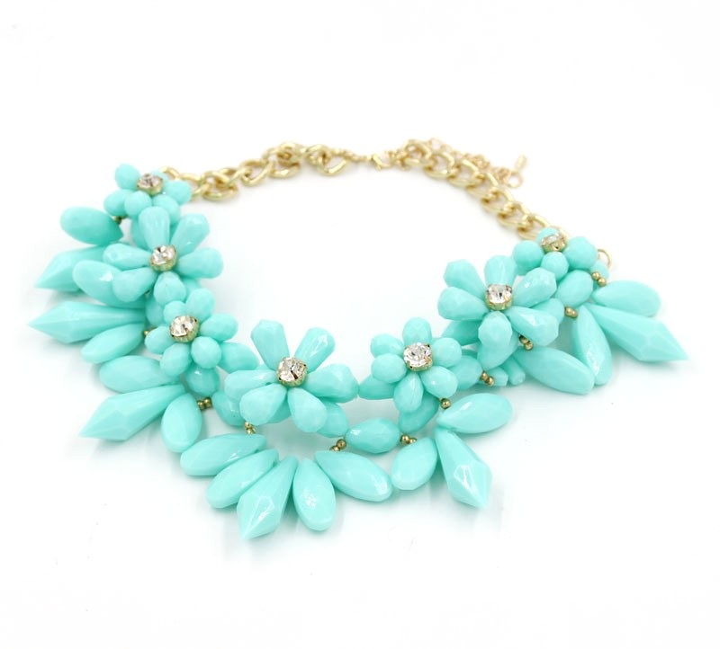 This design is very eye catching and striking. We have this necklace in turquoise as well as pale grey-just email us should you wish to order translucent grey instead. The Chunky Turquoise Flower Necklace is best suited to wear with a plain top or outfit as to not over-dress the design. Everywhere you wear this piece, you will get compliments 🙂