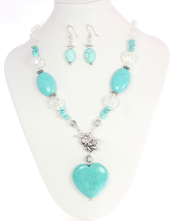 ‘Love Cast in Stone’ Turquoise Gemstone Heart Necklace with crystals and decorative center silver-dipped Clasp.